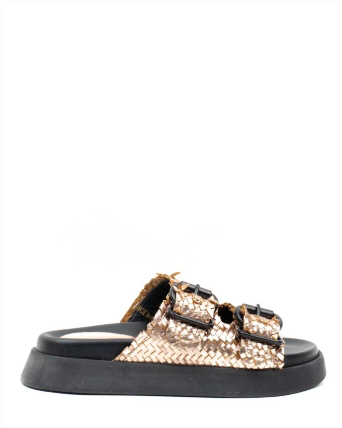 Leather upper in woven metallic rose gold