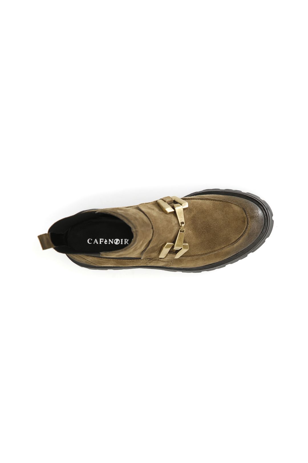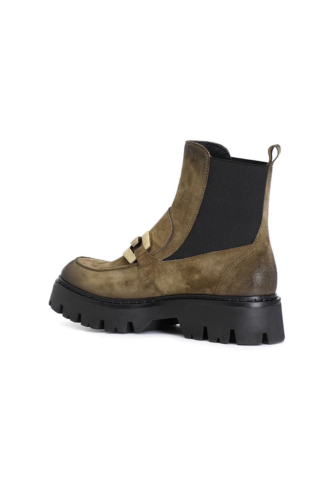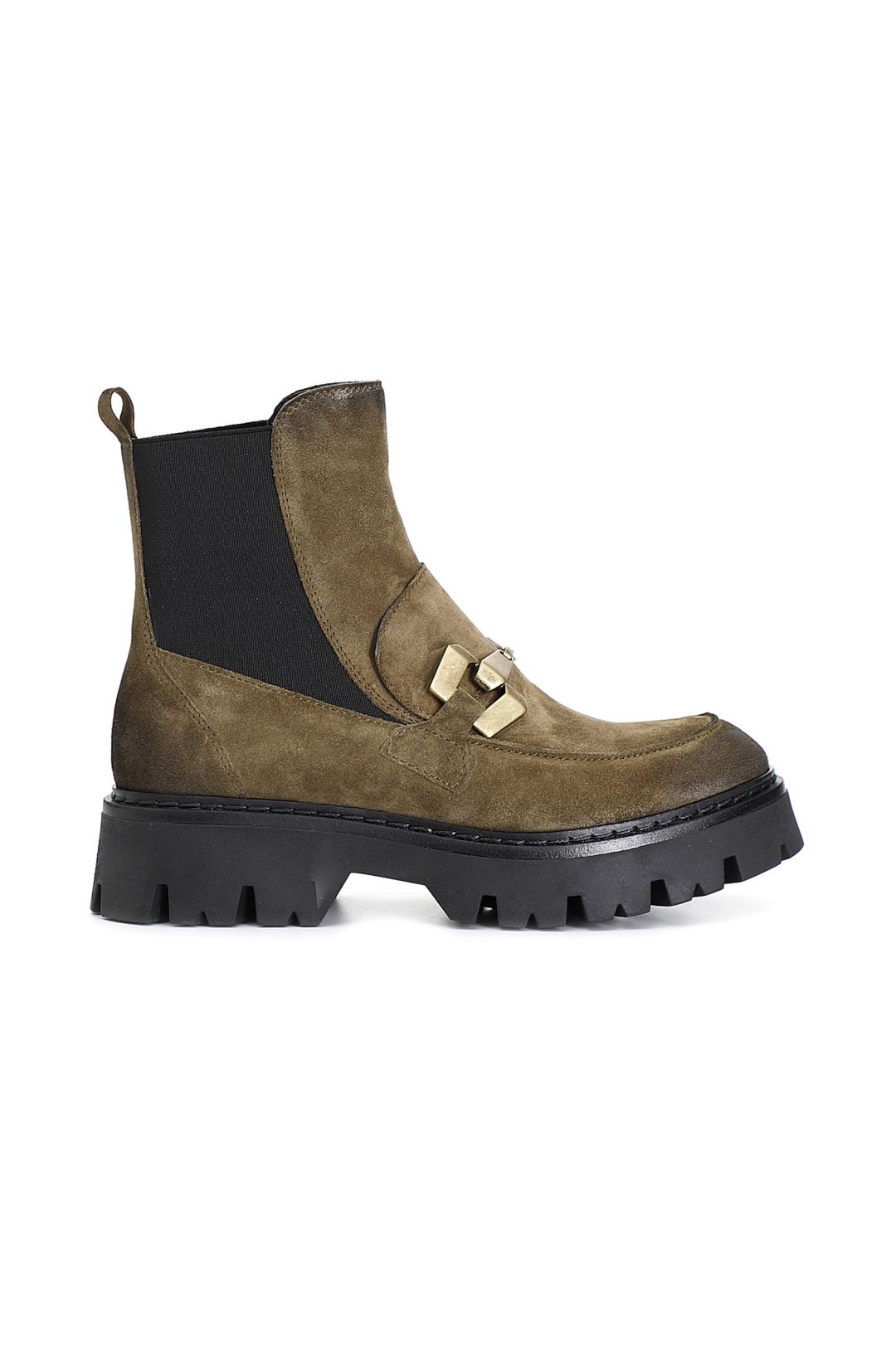 Khaki green suede ankle boot embellished with a horsebit and with stretch panel on the side. The insole is leather. Rubber sole unit