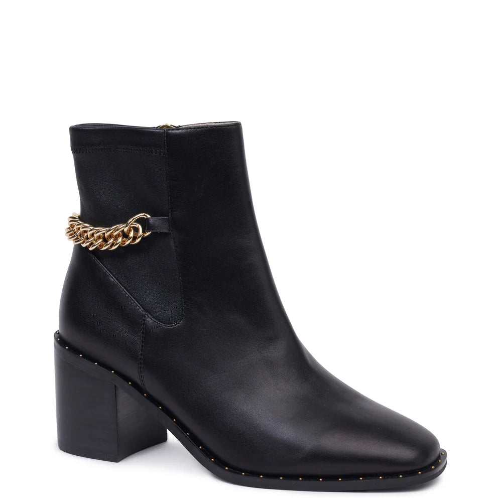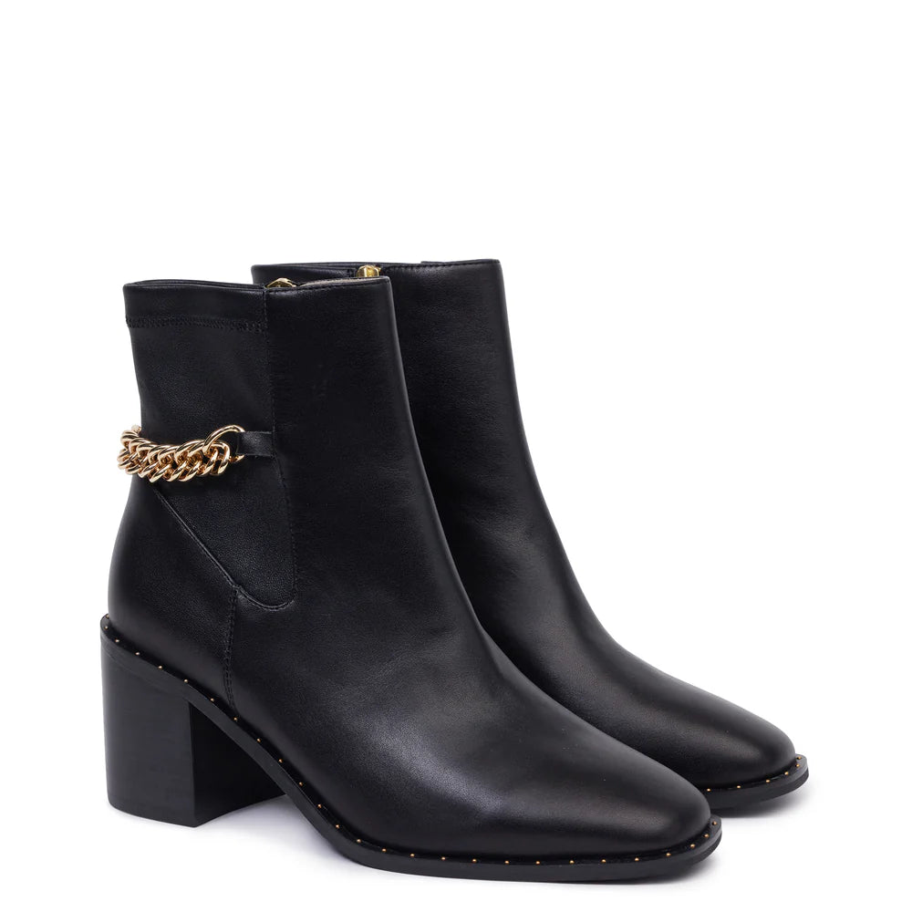 Style with endless looks this season and beyond, the Heather Boot is crafted from smooth leather with a wooden veneer heel. The look is finished with a gold chain across the back and subtle gold stud welts around the sole. Your new go-to boot will take you from work to dinner and beyond.