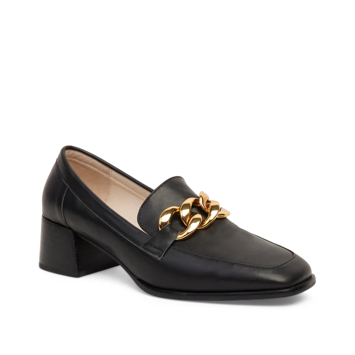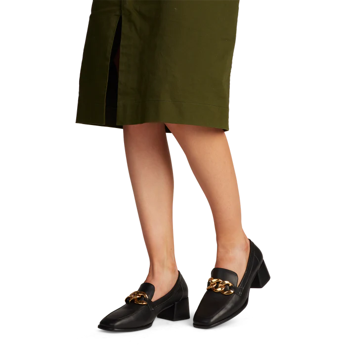 Add height to your loafer look. Adorned with chunky curb chain detailing, the Pixie Loafer is sat on a subtle block heel,  finished with a soft leather