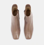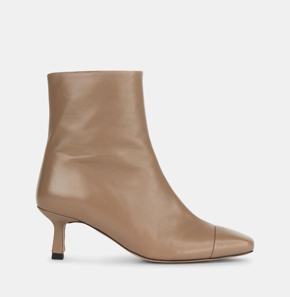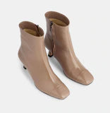 Made from ultra-soft, nappa leather, the beautiful Falula Boot sits tight and smooth around the foot. Set on a graphic kitten heel, the boot has a monochrome sole and heel and detailed with a patent trim at the square toe.