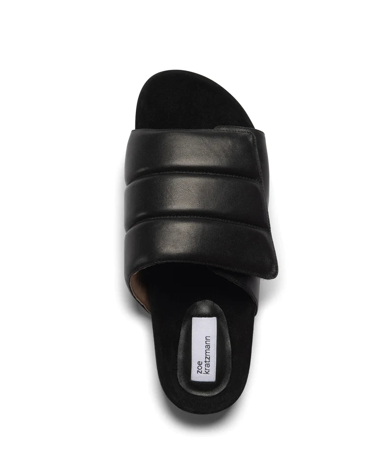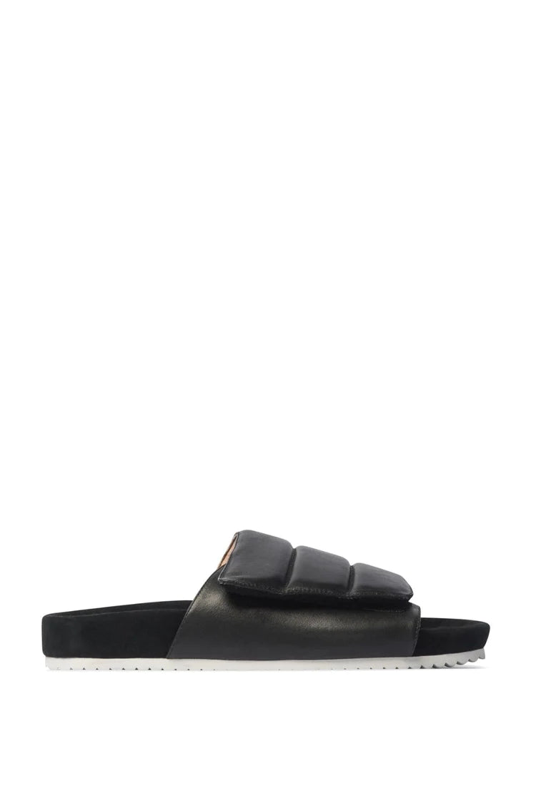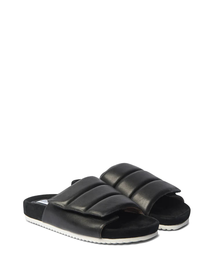 The float is both laid-back and lavish. a puffy, cushioned leather slide is luxe yet casual. hidden velcro creates adjustable width in the upper. the suede lining on a flexible sole is finished with contrasting white rubber for a crisp, casual vibe. wear yours with pants and skirts for endless versatility. see product details below.